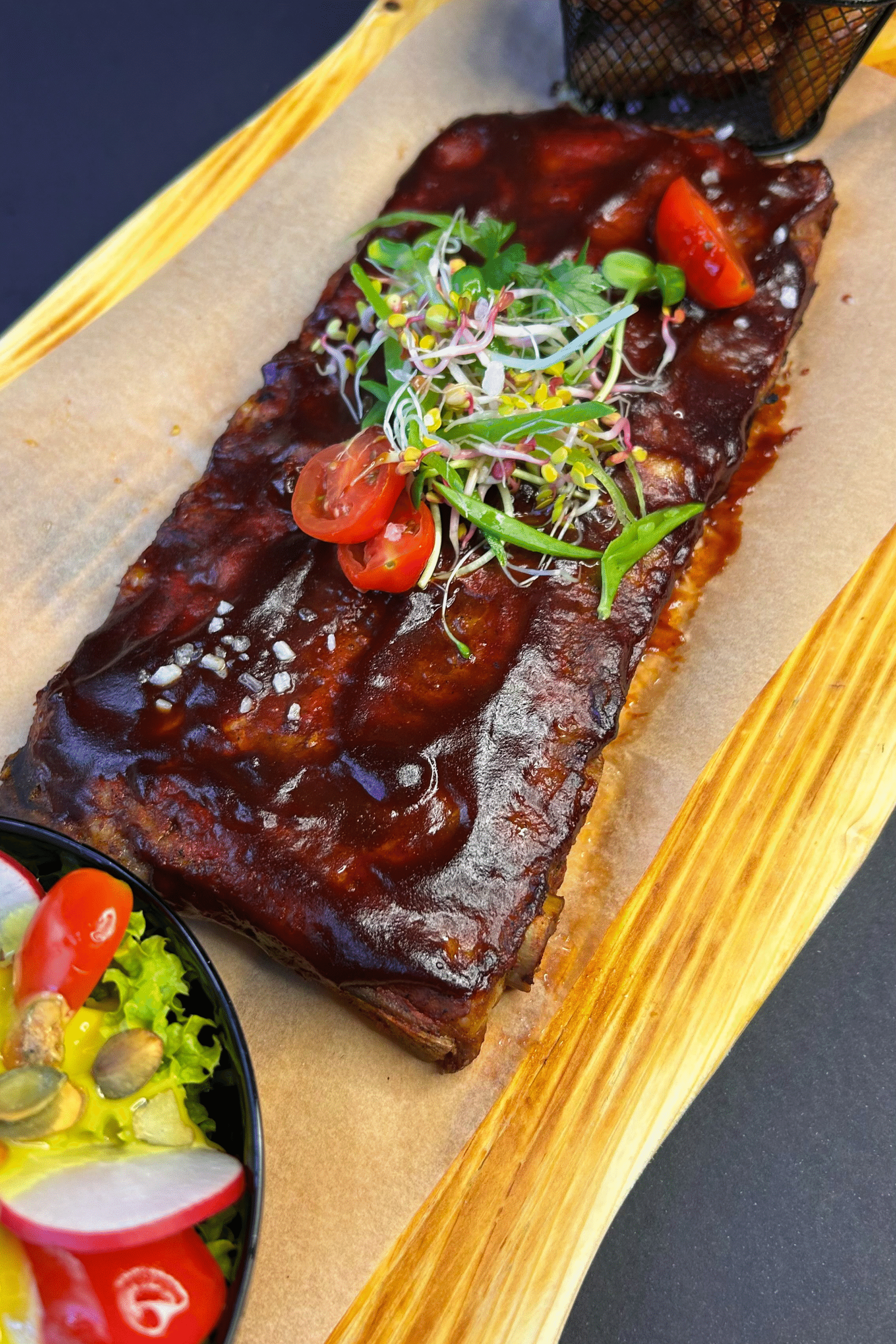72złWolno pieczone żeberka wieprzowe w sosie BBQ podane z ziemniakami opiekanymi i miksem sałat