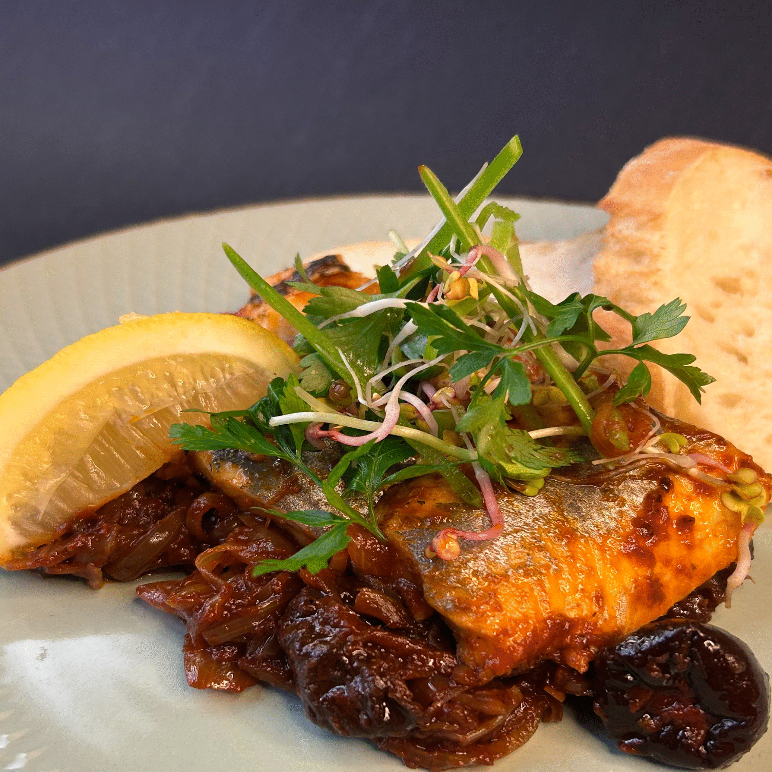 69złSmażony filet z zębacza podany z purée z batatów i potrawką z cebuli, kaparów i suszonych pomidorów